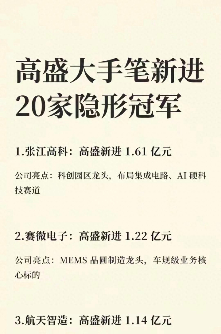 最近刷到不少东谈主在传高汜博手笔新进20家A股隐形冠军的名单,从张江高科1.61亿的新进持仓,到赛微电子1.22亿的布局,再到航天智造1.14亿的买入,每一家都标注了明确的资金范围和赛谈亮点,不少东谈主拿着这份名单,就像拿到了金钱密码,以为随着外资巨头抄功课,就能稳稳踩中行情。其实我看到这份名单的时候,第一响应不是速即去搜代码跟风买入,而是想千里下心搞显著,高盛为什么会在这个节点调理布局这些公司?这些被称作“隐形冠军”的企业,信得过的含金量到底在哪?外资的这套选股逻辑,到底适不合适咱们普通投资者?今天就用大口语跟寰球聊透这件事,莫得晦涩的专科术语,全是实打实的干货,既帮寰球逃匿盲目跟风的坑,也信得过看懂外资布局背后的中枢门谈。