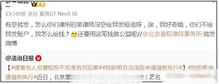 2025年4月陈妍希胜诉后,法院判对方赔四万块钱并公开谈歉,可那东谈主一直拖着不给,陈妍希的讼师团队只须去肯求强制试验,这事底本挺日常,但阿谁黑粉短暂跳出来说“赔一万就行,其他算讼师费”,还发图说陈妍希卖赝品,问讼师奈何不给收款账户,搞得粗糙他才是受闹心的东谈主。