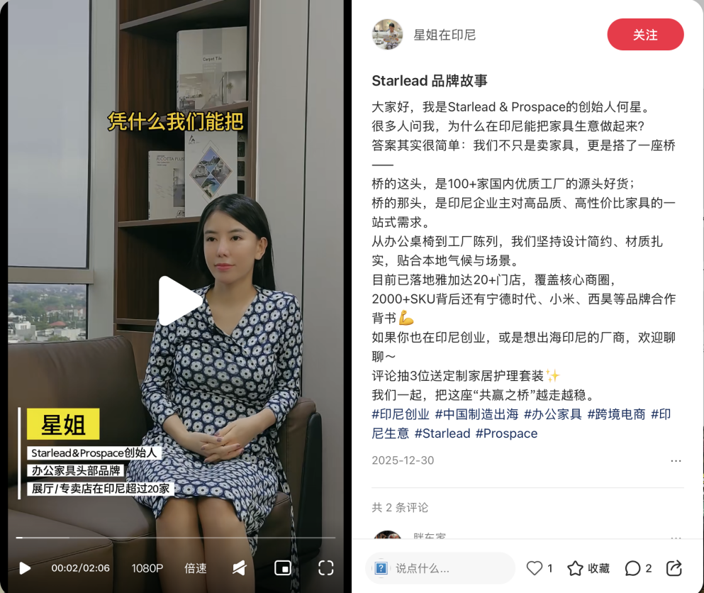 据自称是Starlead&Prospace创举东谈主的何星于小红书平台发布的实质,Starlead之是以能在印尼把产品生意作念起来,是因为其不单是卖产品,同期还为国内货源与印尼需求搭建了一座桥梁。