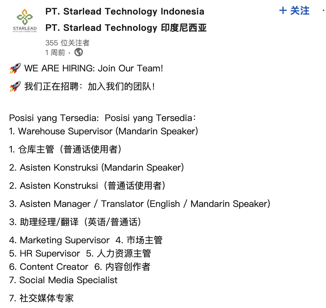Starlead在领英的招聘信息自满,公司于印尼当地的职位将“和会俗语”看成首要招聘范例,可见其业务与国内绑定较深。
