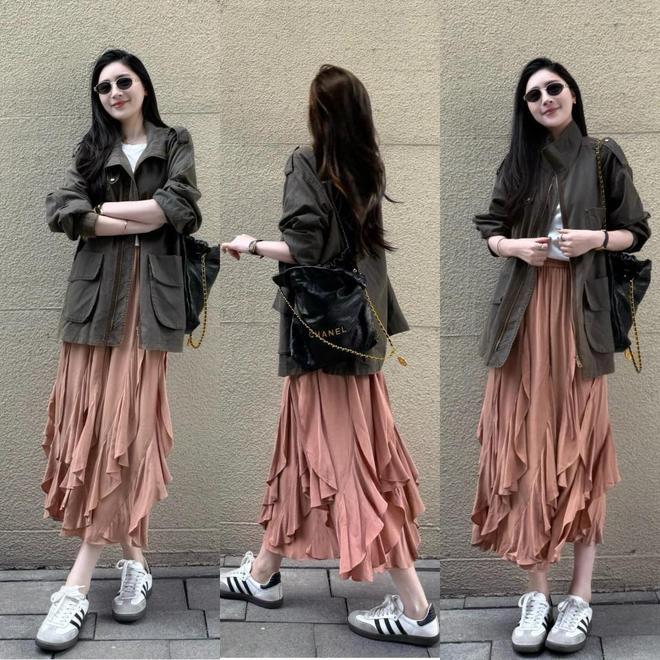 或是衣着一条灰色压褶短裙,配上卡其色夹克外衣,配上豹纹的德训鞋,这么的穿搭更个性,使得穿搭者可甜可盐。