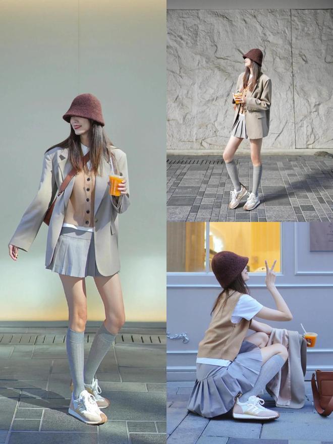 不外别盲目追赶潮水,找到适当我方的智商让我方变得更好意思。举例浅灰色的西装外衣内搭杏色的诚挚开衫,叠穿白 T 恤,加上一条灰色的短裙。