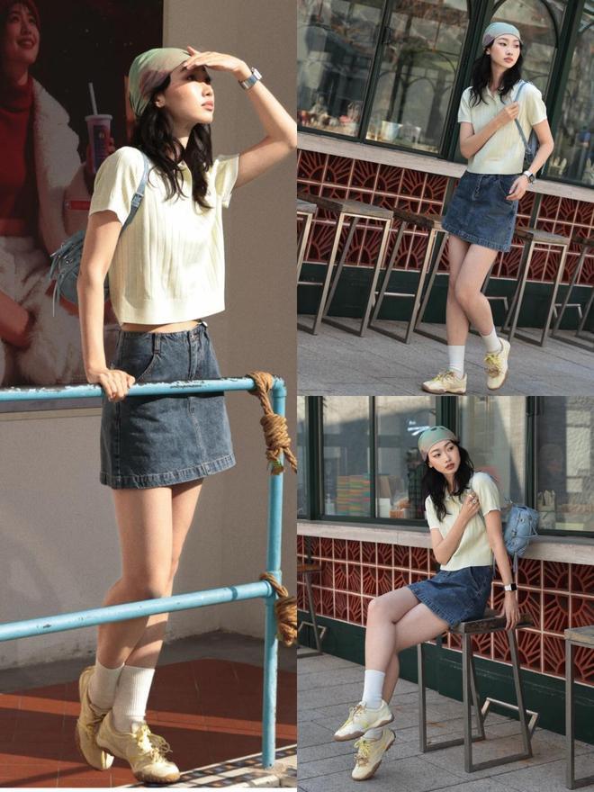 若思我方的穿衣格调甜好意思俏皮有活力,00后的好意思仙女不妨遴荐一件浅黄色的诚挚短袖,配上牛仔 A 字短裙,造成露腰穿搭,呈现小蛮腰,又能展现修长好意思腿。