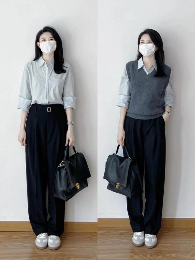 职场女性不妨换成一件雾霾蓝的衬衫,配上藏蓝色的西装直筒裤,脚踩灰白拼接的经典德训鞋,既清静又失业。还不错再添加一件灰色的诚挚背心,让造型更有档次感。