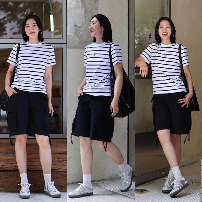 如若偏疼酷感的穿衣格调,可选一对最经典的灰白拼接德训鞋,配上工装短裤,配上一件经典的长短条纹短袖 T 恤,这么的穿搭宽泛逛街上班都适配。