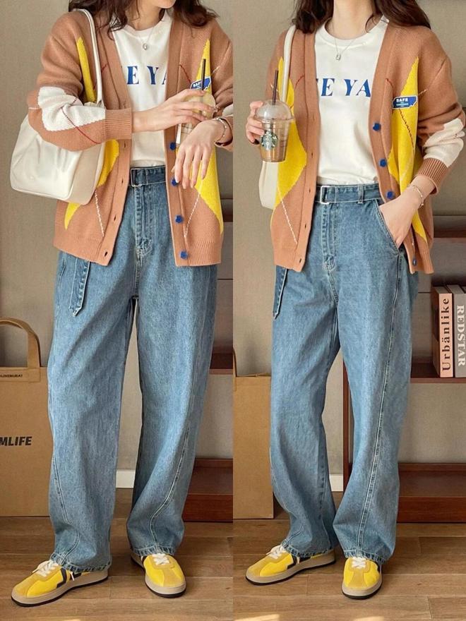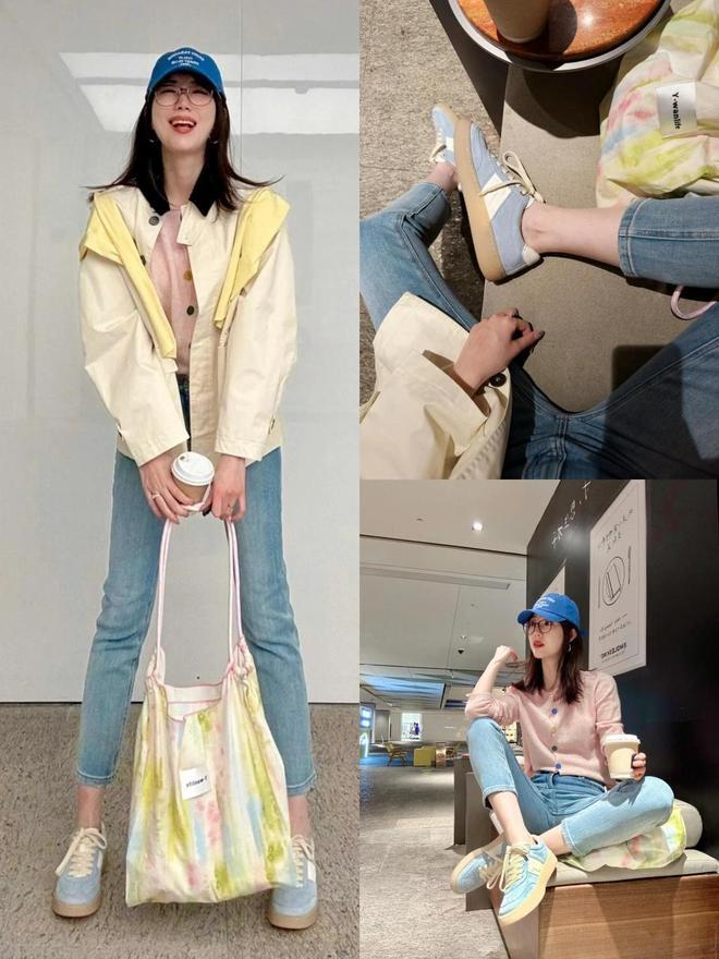 举例上头这一套穿搭,诚挚开衫就有鹅黄色,这时就遴荐一对鹅黄色的德训鞋来搭配下装,用天生就领有先锋感的牛仔裤来穿搭,既温存又个性。
