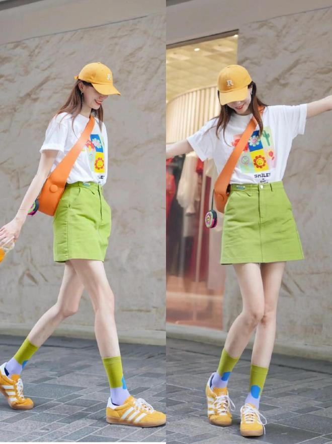 德训鞋项目大同小异,色调就有所不同,我们不错凭据我方的穿衣配色来决定我方遴荐的鞋子色调。当我们遴荐牛油果绿的 A 字短裙,配上印花图案的白色短袖 T 恤。