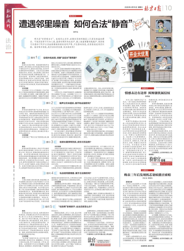 日常生涯中,邻里在房屋使用、要领安设等方面不免产生不合。民法典第二百八十八条文矩,不动产的相邻权力东谈主应当按照成心分娩、便捷生涯、配合互助、公道合理的原则,正确处理相邻关系。因此,居民在安设空调、装修施工前,应提前与邻居相通,尽量弃取合规位置并作念好降噪要领,幸免激励矛盾。遇到杂音扰乱时,需提神留存噪声检测纪录、相通纪录、视频音频等根据,以便更好地堤防自身正当权益。