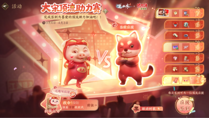 3月6日,猪猪侠联动崇拜开启,玩家参与[大宋顶流助力赛]举止,就能为血河小狗和猪猪侠应扶持力,获取联动奖励。
