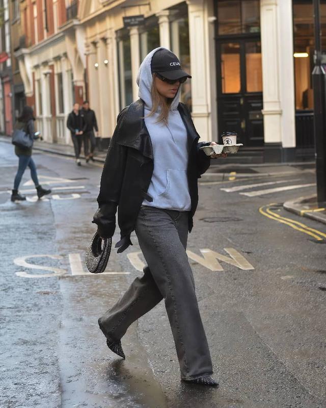 穿衣弗成中规中矩,就像一组造型当中,格调无需太过调解,偏失业的卫衣和牛仔阔腿裤,提出用皮夹克均衡造型,增添一点酷感,卫衣招揽连帽款,显现帽子更有档次,同期还能荫藏肩颈问题。