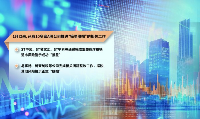据上海证券报记者不齐全统计,1月以来,已有10多家A股公司鼓吹“摘星脱帽”的关联使命,既有ST中装(维权)、ST名家汇等公司通过完成重整局势根除退市风险警示告捷“摘星”,也有易事特(维权)、新亚制程(维权)等公司完成关联问题整改使命,开脱其他风险警示郑重“脱帽”。